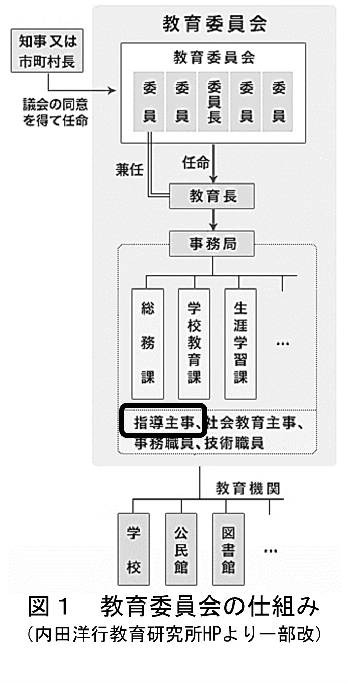 中教審教育制度分科会地方教育行政部会「地方分権時代における教育委員会の在り方について(部会まとめ)」 (2005) の2.3 (4) は,教育委員会事務局の体制強化や指導主事の配置促進を求めるとともに,指導主事が教育委員会の中核をなすと述べている(教育委員会の仕組みについては図1参照)。2003年度の文部科学省「地方行政調査」によると,全国の市町村全体の指導主事配置率は34.40%に留まり,その後2011年度に61.60%に上昇したものの,主に市町村合併の影響を受けた結果 (押田, 2014)であり,市町村の規模が小さくなるほど指導主事の配置は不十分なままである。また,指導主事の職務全体に占める行政事務の割合が7割を超え,本務であるべき教員への指導助言に専念できていない状況を明らかにした老山 (1996) や,重要施策の予算作成や議会対応への関与などが指導主事の勤務を多忙化させ,教員への指導助言に相対的に関われていないと述べた宮坂 (2017) などによって,職務の多様化・多忙化が指導主事の置かれている状況をさらに困難なものにしていることが分かる。中教審は2005年に「これからの学校教育を担う教員の資質能力の向上について」を答申し,教員の資質能力の向上のため,教員研修のさらなる充実と指導主事の配置促進の必要性を強調しており,教員の資質能力の確かな向上のためには指導主事の存在が欠かせないことが改めて確認されたと言えよう。