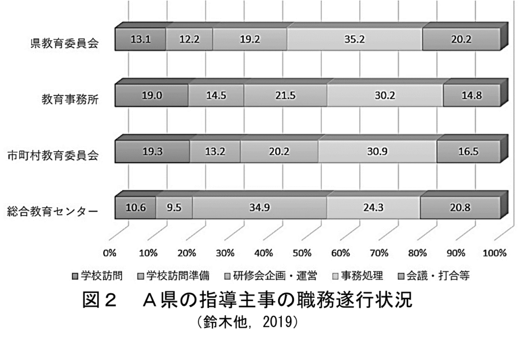 図2は,A県内全ての指導主事を対象とする研修に参加した152名に,自身の職務遂行状況について問うた質問紙調査の回答を集計,グラフ化したものである(鈴木他, 2019)。グラフから,職務の半分程度が事務処理や会議・打合に当てられ,準備のための時間を除くと,多くても2割程度しか実際の指導助言に当てられていない。図2からは,2で指摘した指導主事の職務の多様化・多忙化といった課題が見えてくる。多様な業務の一つ一つに適切に対応することは容易ではないが,新たに指導主事として教育委員会に配属される者にとっては,前年度末ぎりぎりまで学校現場で教員として勤務し,翌年度初日からは特段の研修を受けることなく新たに指導主事を名乗り,その任に当たることとなる。こうした指導主事を巡る困難な状況を改善できないかと考えたことが本研究の端緒となった。